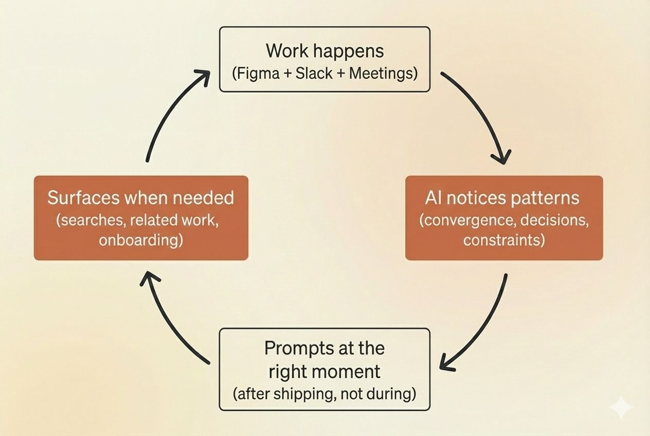 Right after you ship, you get a small notification: “I noticed you explored several navigation approaches and mentioned vendor constraints. Want to save the context?” Click it, and there’s already a draft decision record. It’s pulled from your Slack discussion, your Figma iterations, and those design review meetings where you explained the tradeoffs.