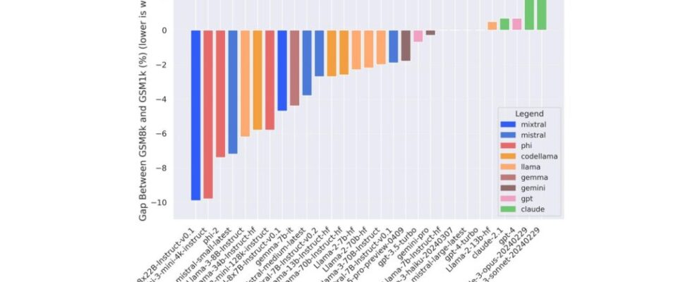 Models arranged by their drop in performance between GSM8k and the newly created GSM1k (lower is worse). Mistral and Phi models show a drop of 10% on GSM1k compared to GSM8k (Zhang et al., 2024).