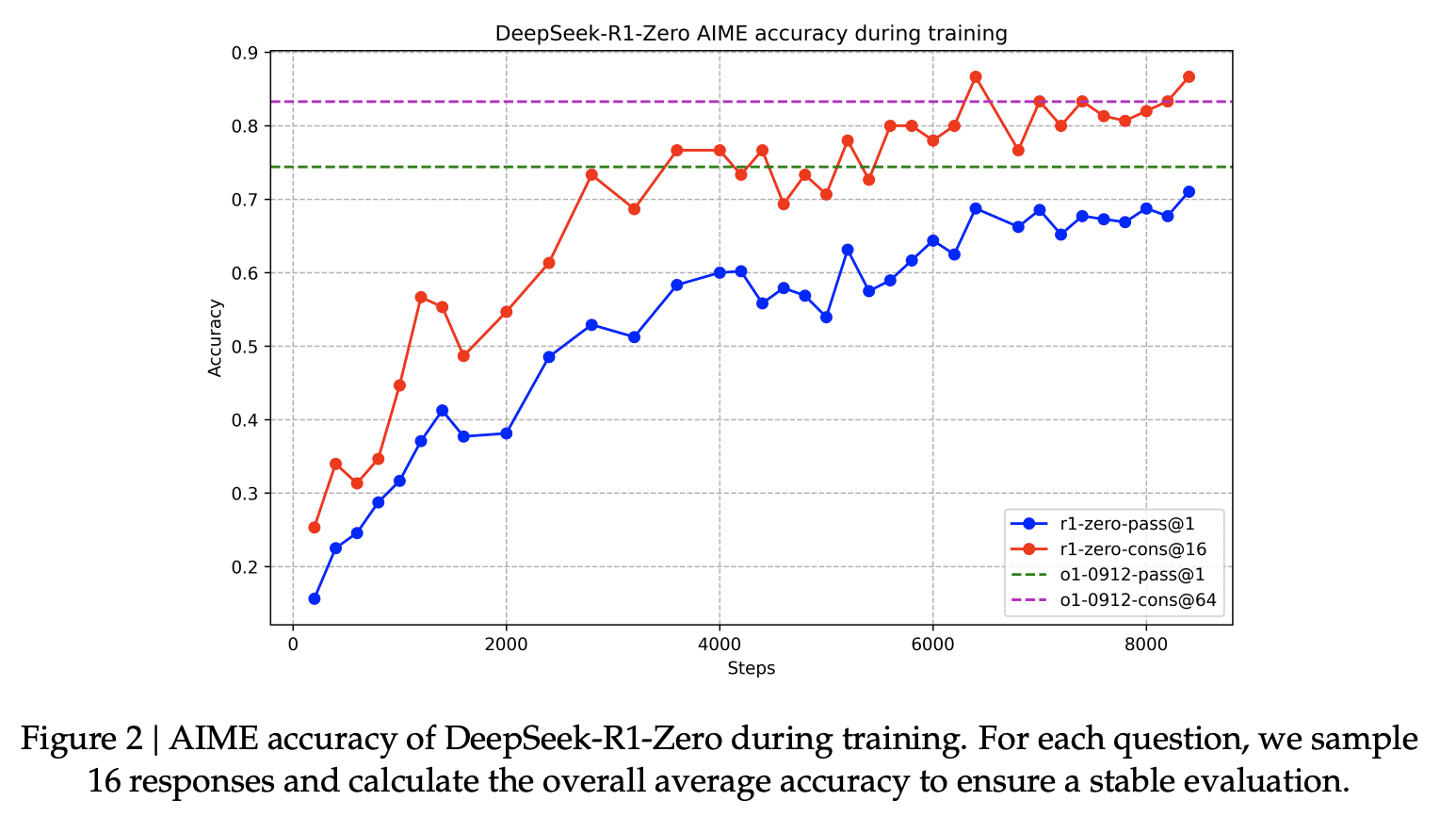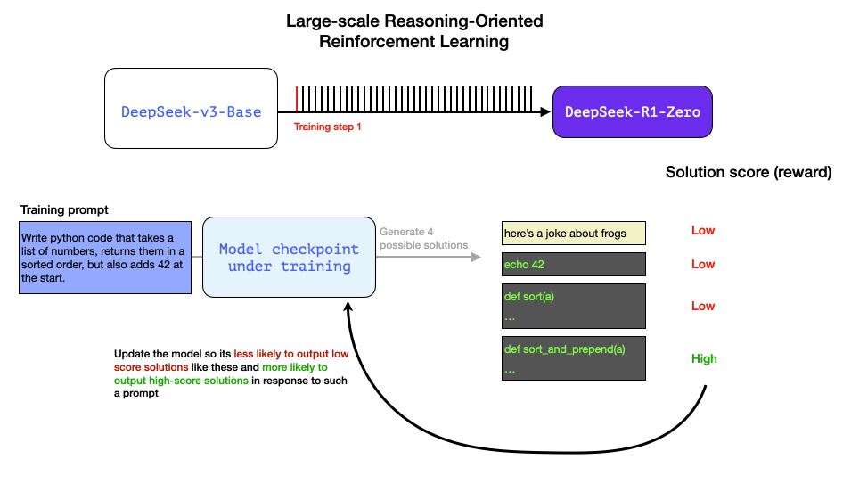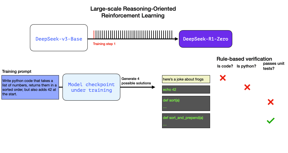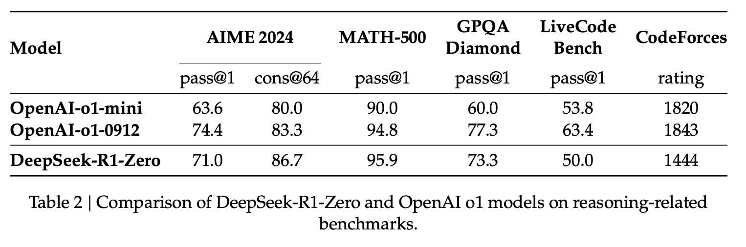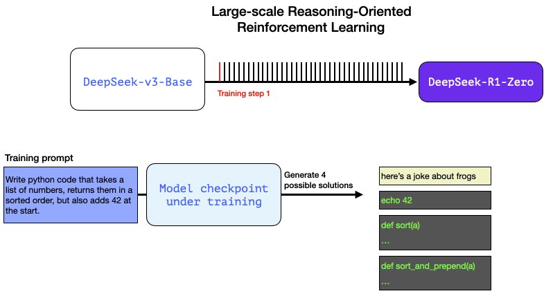 R1-Zero is special because it is able to excel at reasoning tasks without having a labeled SFT training set. Its training goes directly from a pre-trained base model through a RL training process (no SFT step). It does this so well that it’s competitive with o1.