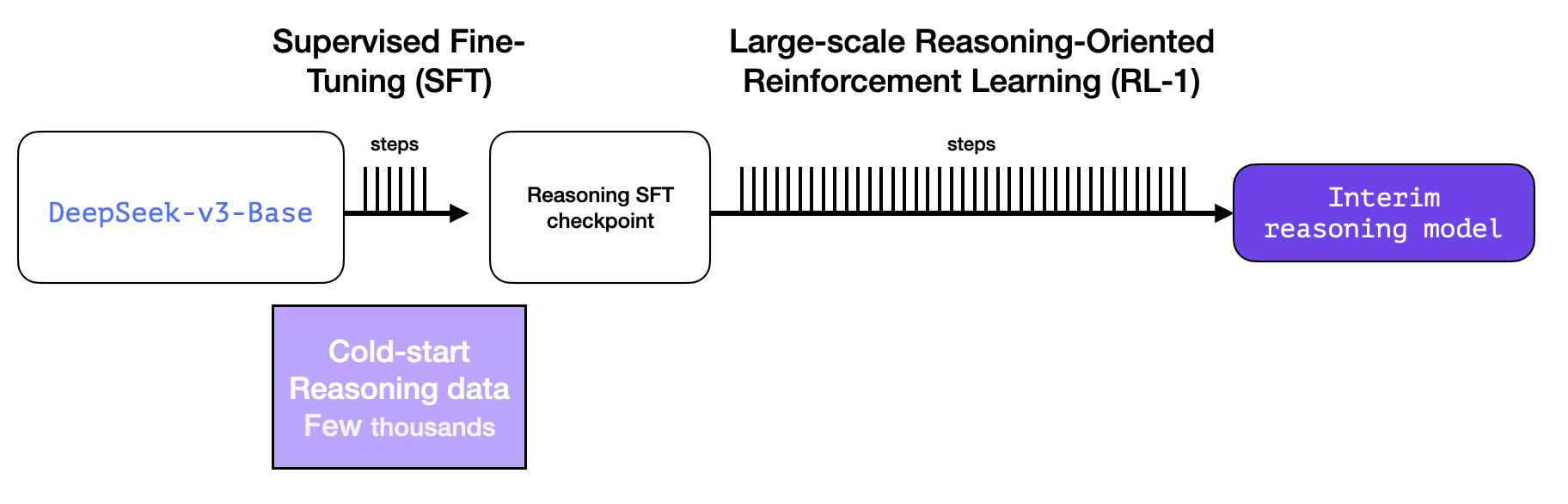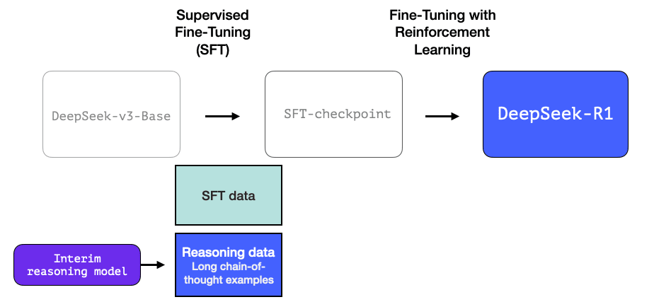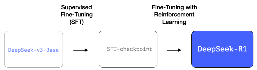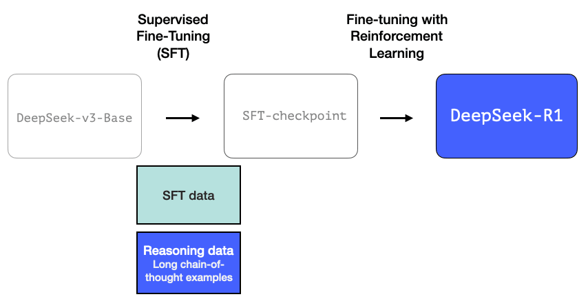 DeepSeek-R1 follows this general recipe. The details of that first step come from a previous paper for the DeepSeek-V3 model. R1 uses the base model (not the final DeepSeek-v3 model) from that previous paper, and still goes through an SFT and preference tuning steps, but the details of how it does them are what’s different.