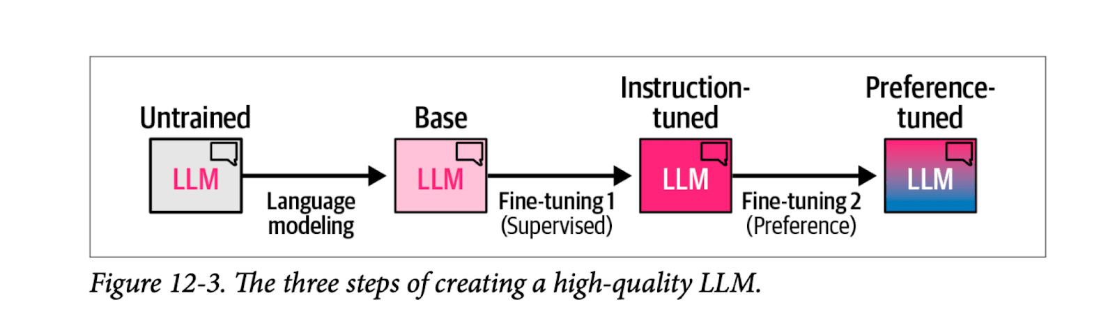 The following figure, from Chapter 12 of our book shows the general recipe of creating a high-quality LLM over three steps: