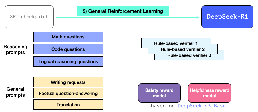 This enables R1 to excel at reasoning as well as other non-reasoning tasks. The process is similar to the the RL process we’ve seen before. But since it extends to non-reasoning applications, it utilizes a helpfulnes and a safety reward model (not unlike the Llama models) for prompts that belong to these applications.