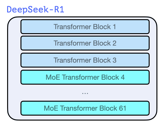 Just like previous models from the dawn of GPT2 and GPT 3, DeepSeek-R1 is a stack of Transformer decoder blocks. It’s made up 61 of them. The first three are dense, but the rest are mixture-of-experts layers (See my co-author Maarten’s incredible intro guide here: A Visual Guide to Mixture of Experts (MoE)).