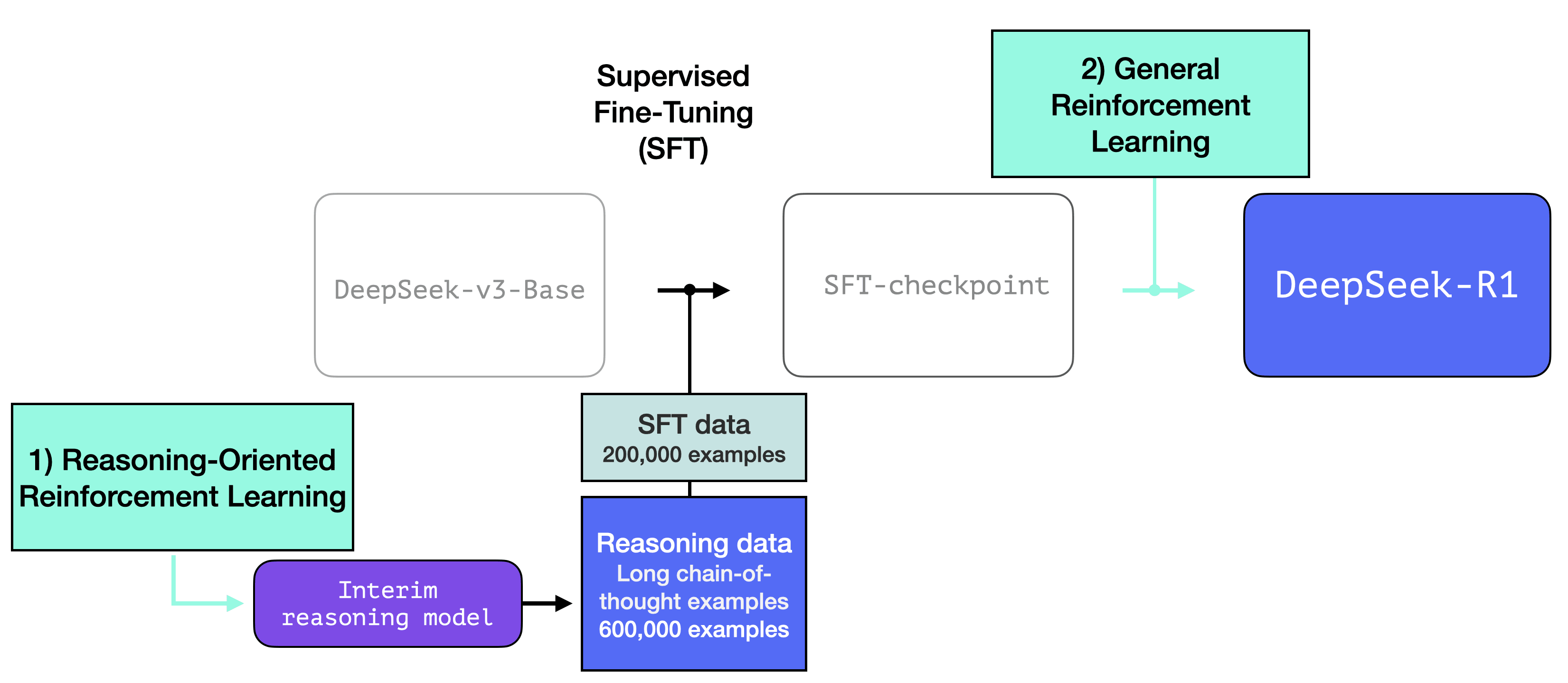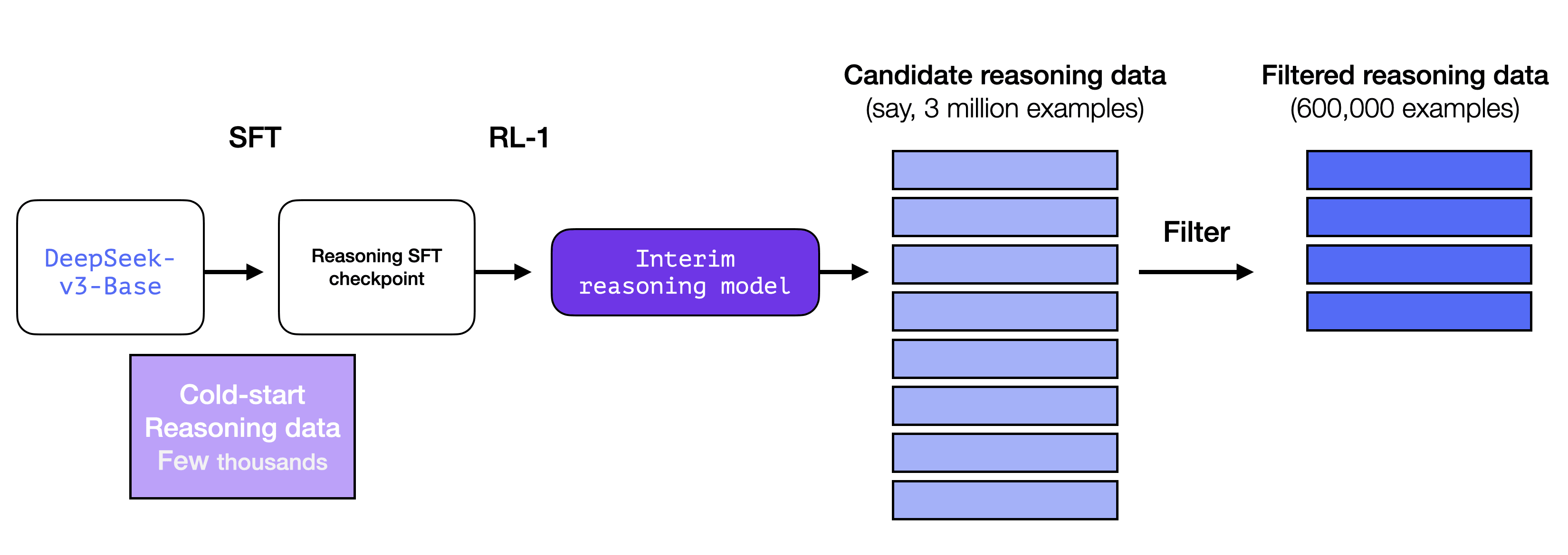 But wait, if we have this data, then why are we relying on the RL process? It’s because of the scale of the data. This dataset might be 5,000 examples (which is possible to source), but to train R1, 600,000 examples were needed. This interim model bridges that gap and allows to synthetically generate that extremely valuable data.