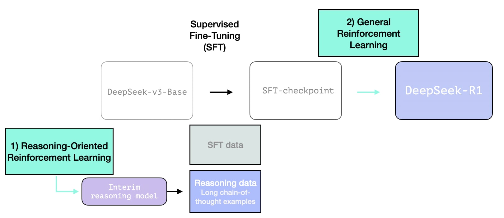 Here, RL is used to create the interim reasoning model. The model is then used to generate the SFT reasoning examples. But what makes creating this model possible is an earlier experiment creating an earlier model called DeepSeek-R1-Zero.