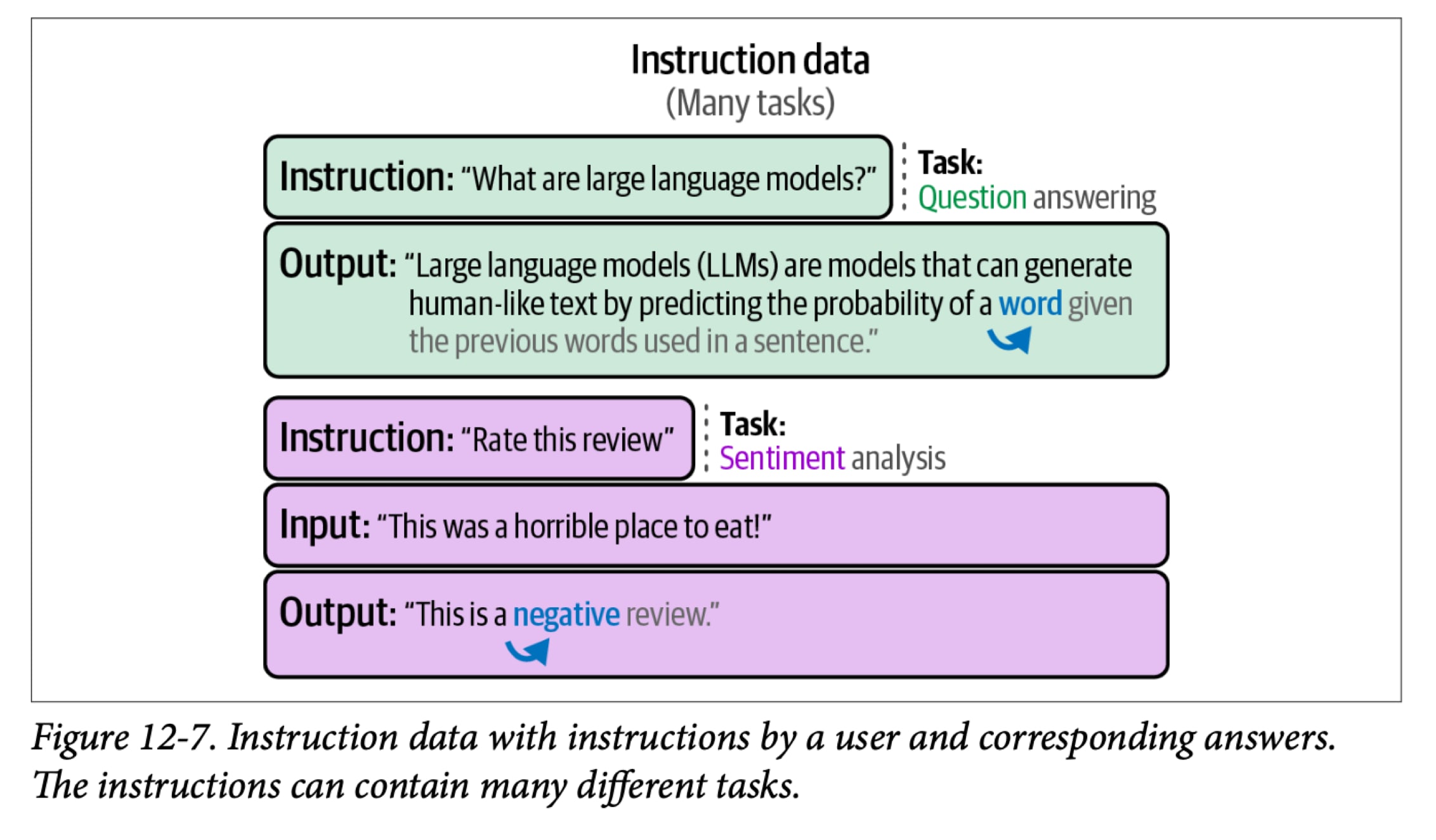 If you’re new to the concept of Supervised Fine-Tuning (SFT), that is the process that presents the model with training examples in the form of prompt and correct completion. This figure from chapter 12 shows a couple of SFT training examples: