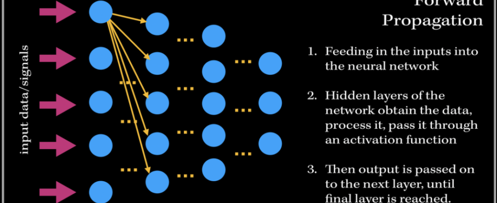 So what does the training process of this neurological-biological computer model-system (aka neural network) look like? It consists of two phases: 1). Forward Propagation and 2). Back propagation. Once we have preprocessed the dataset (such as normalization, reshaping your data to a specific dimension..etc.), we are ready for the training process. We first forward propagate our data—meaning we feed in the inputs into our built neural network.