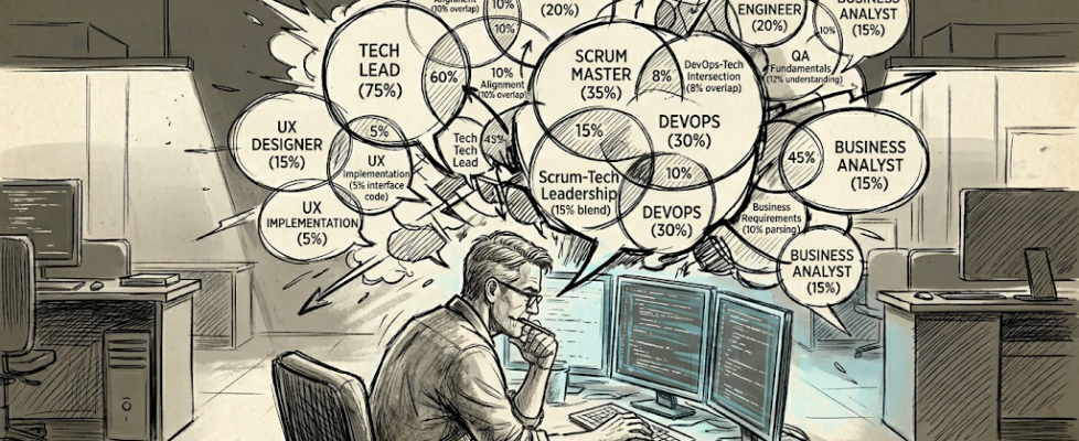 Picture a standard software product team. You have a Product Manager defining what gets built. A Business Analyst translating business requirements into specifications. A UX Designer shaping how the product feels. A QA Engineer validating what gets shipped. A DevOps or SRE Engineer keeping the infrastructure running. A Scrum Master or Project Manager facilitating delivery. A Tech Lead or Architect setting direction.