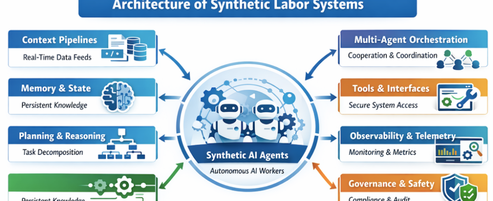 A synthetic labor unit behaves less like a script and more like a digital worker embedded directly into an enterprise. It absorbs real‑time context from the environment, carries forward memory and state across tasks, plans multi‑step actions, and executes them through secure system interfaces. It collaborates with other agents when work requires coordination, exposes its internal reasoning through observability and telemetry, and operates inside governance rails that enforce identity, access, logging, and escalation. All of these capabilities function together as an integrated system rather than isolated features.