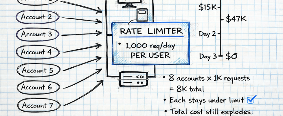 The $47K weekend surprise: When per-user rate limits meet credential stuffing attacks. Each compromised account stayed safely under the 1,000 request daily quota — but 8 accounts × 1,000 requests = catastrophic API bill.