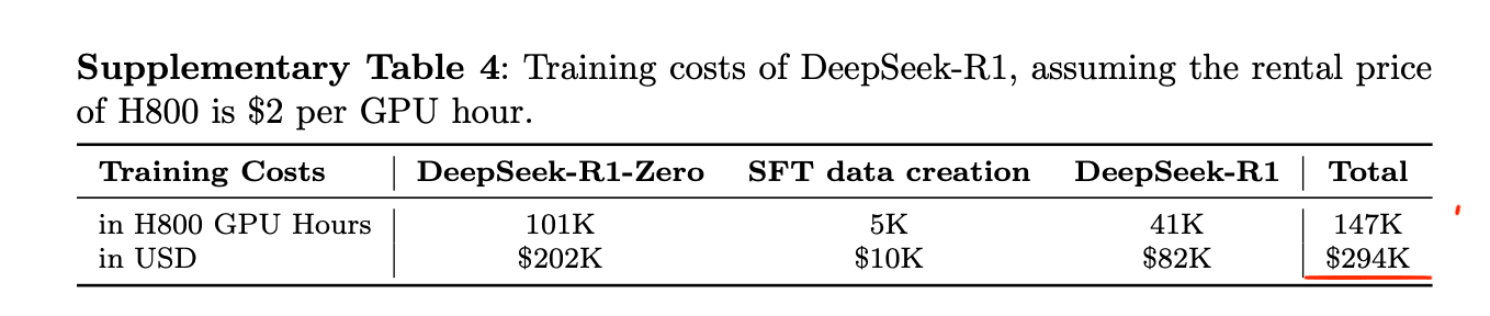 The DeepSeek R1 supplementary materials estimate that training the DeepSeek R1 model on top of DeepSeek V3 costs another $294,000, which is again much lower than everyone believed.