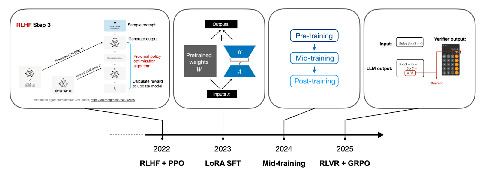 Back then, I considered these as pre-training techniques, since they use the same pre-training algorithm and objective. Today, these slightly more specialized pre-training stages, which follow the regular pre-training on general data, are often called “mid-training” (as a bridge between regular pre-training and post-training, which includes SFT, RLHF, and now RLVR).