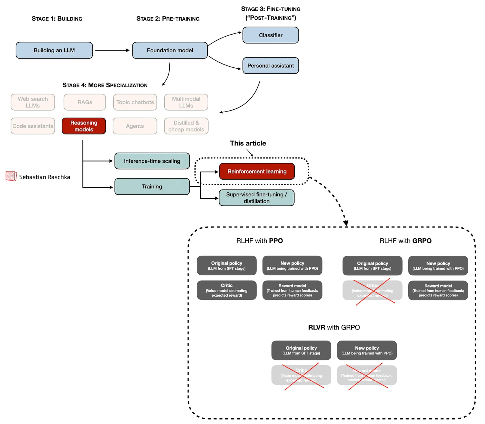 The V in RLVR stands for “verifiable,” which means we can use deterministic approaches to assign correctness labels, and these labels are sufficient for the LLM to learn complex problem-solving. (The typical categories are math and code, but it is also possible to expand this idea to other domains.)