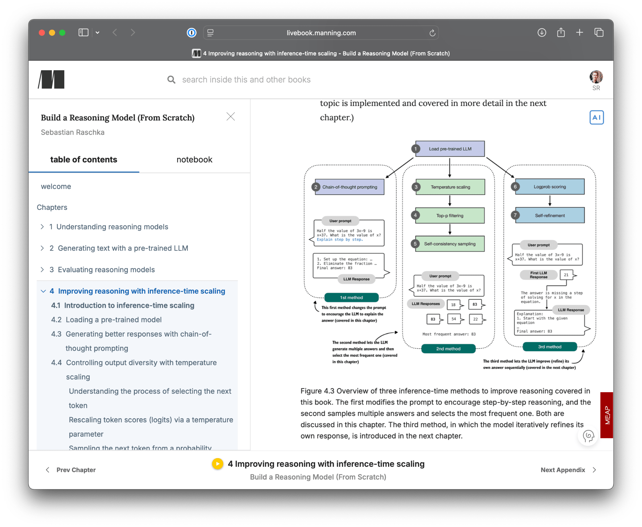 The reasoning model book then picks up where the first book leaves off. Starting from a pre-trained base model, it explores inference-time scaling methods and reinforcement learning techniques aimed specifically at improving reasoning capabilities.
