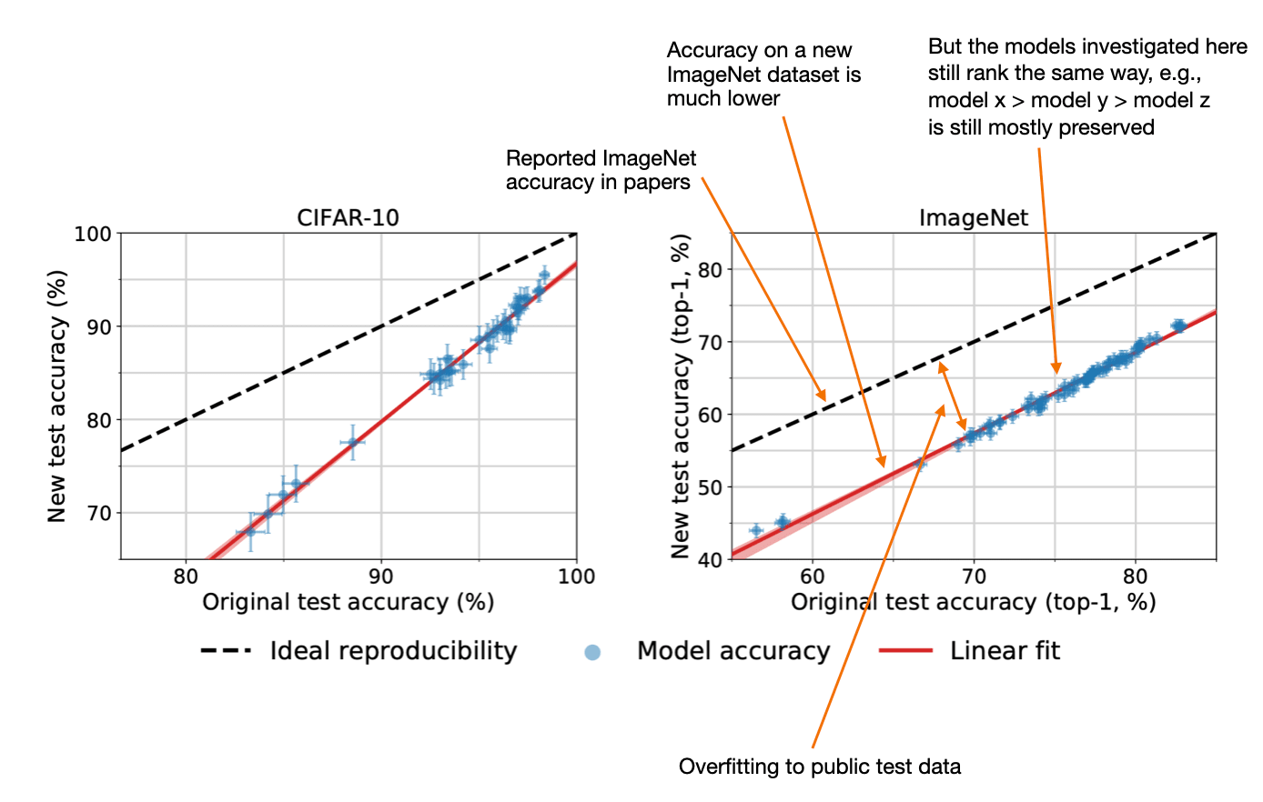 Back in the day, even if benchmark scores on public test sets were inflated, at least the model ranking was still preserved. E.g., see the annotated figure from the 2019 Do ImageNet Classifiers Generalize to ImageNet? paper below.