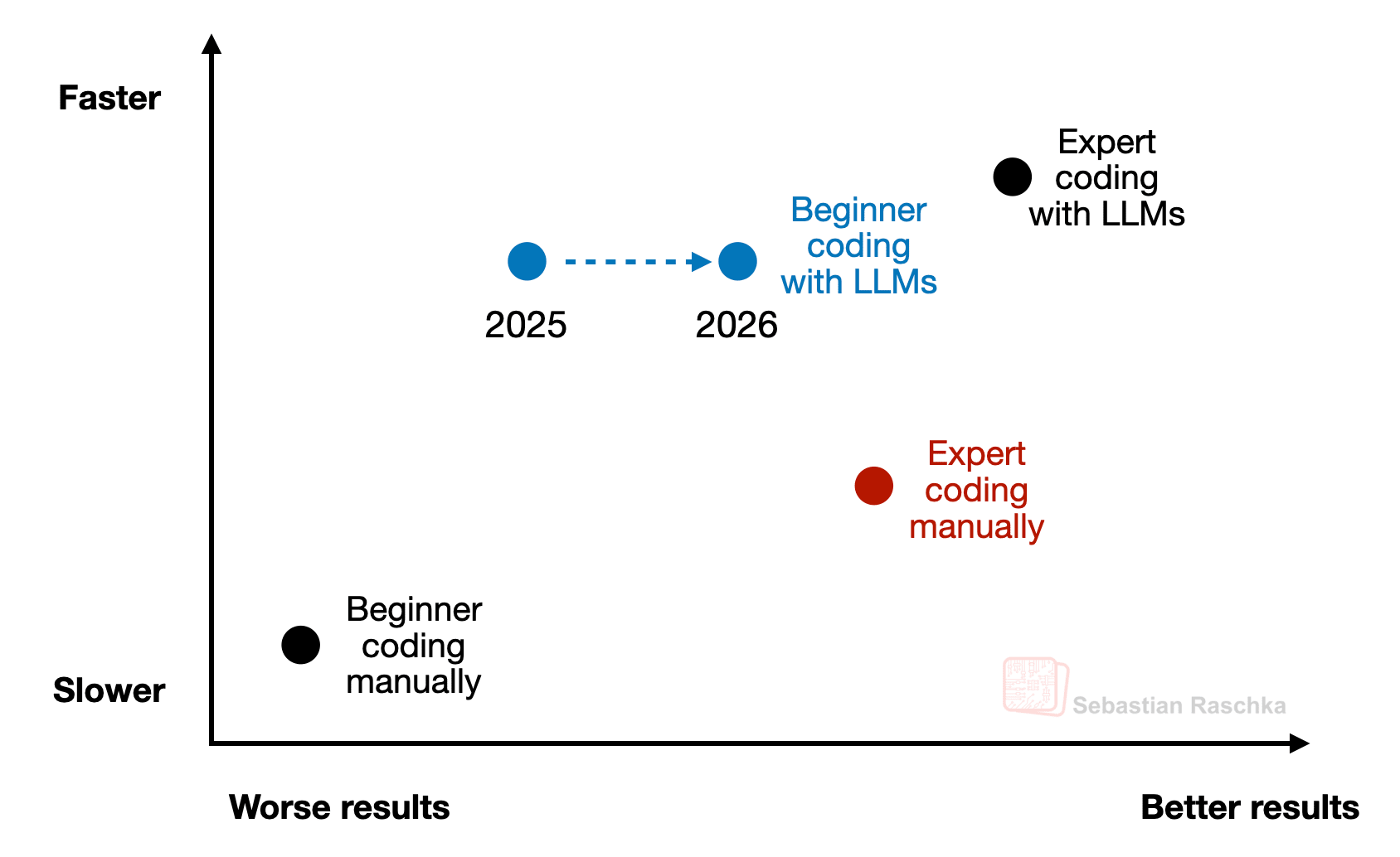 Today, I still write most of the code I care about myself. With “care about,” I mean in contexts where it matters that I understand the code and that the code is correct. For example, if I set up an LLM training script, I would implement and carefully go over the training logic. This is a) to make sure it’s doing what I think it should be doing and b) to preserve my knowledge and expertise in this task. However, I now use LLMs to add the more mundane code around it, such as adding a command-line argparse boilerplate so I can use my own code more conveniently from the command line.