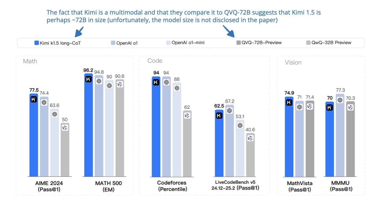 Another key idea here is that scaling the context length (up to 128k tokens) helps the model plan, reflect, and self-correct during reasoning. So, in addition to the correctness reward that is similar to DeepSeek-R1 they also have a length reward. Specifically, they promote shorter correct responses, and incorrect long answers get penalized more.