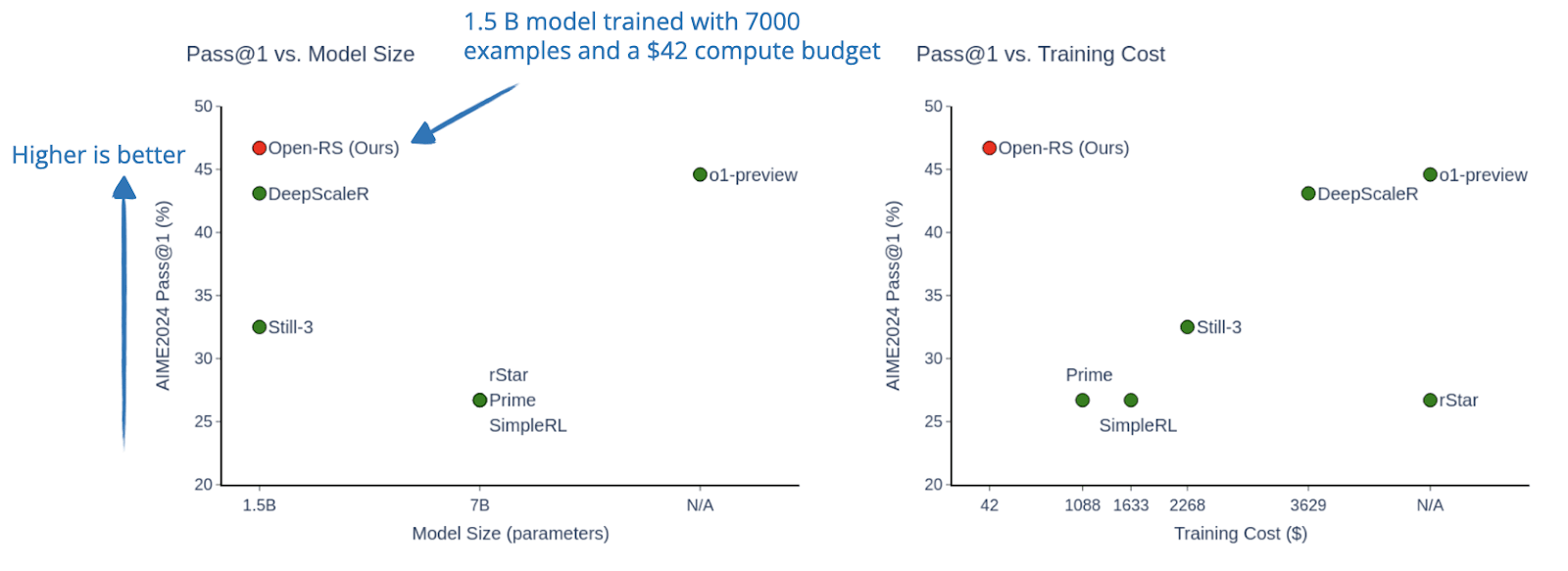 So, using the 1.5B DeepSeek-R1-Distill-Qwen model, they find that with only 7000 training examples and a $42 compute budget, RL fine-tuning can lead to strong improvements. In this case, the improvements are enough to outperform OpenAI’s o1-preview on the AIME24 math benchmark, for example.