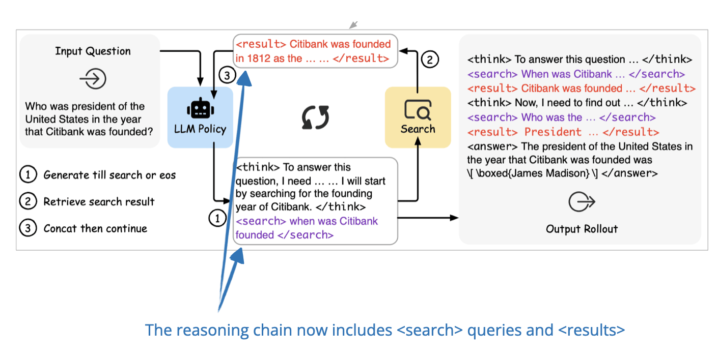 The ReSearch framework proposed in this paper extends the RL method from the DeepSeek-R1 paper to include search results as part of the reasoning process. The model learns when and how to search based on its ongoing reasoning chain, and it then uses the retrieved information for the next steps of reasoning.