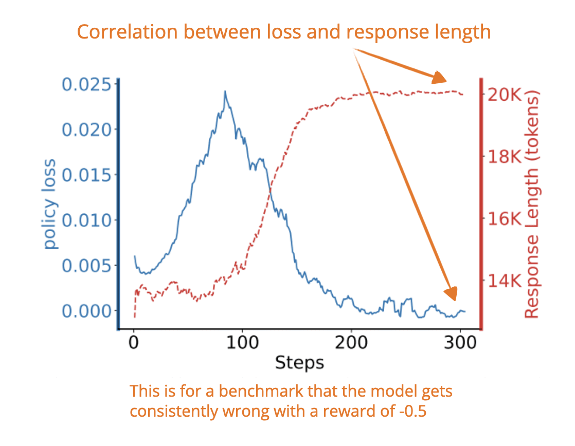 So the model “learns” that longer responses reduce the punishment, even though they are not helping correctness.