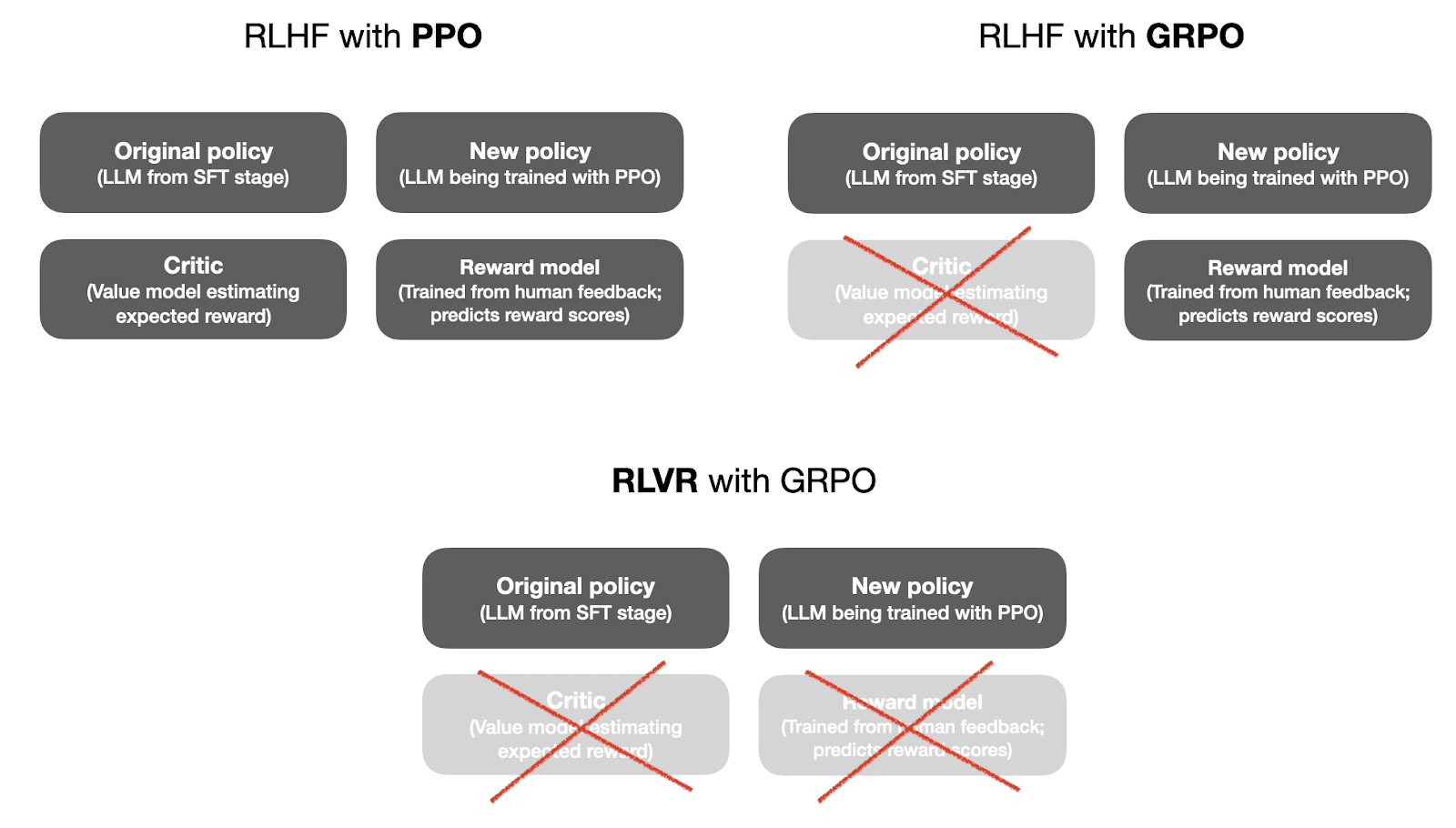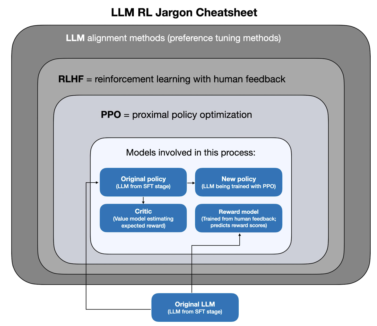 Then, RLHF further aligns the LLM using an algorithm called proximal policy optimization (PPO). (Note that there are other algorithms that can be used instead of PPO; I was specifically saying PPO because that’s what was originally used in RLHF and is still the most popular one today.)