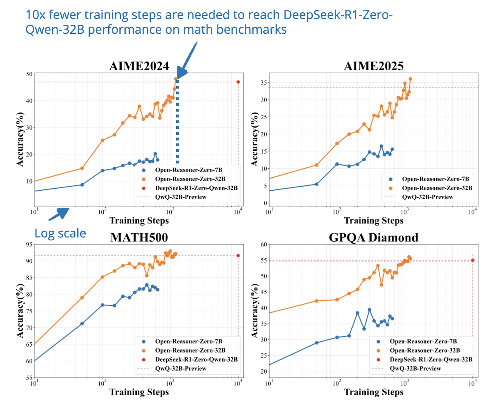 Using the same Qwen-32B base as DeepSeek-R1-Zero, their model outperforms it on multiple reasoning benchmarks while requiring only 1/10 the training steps.