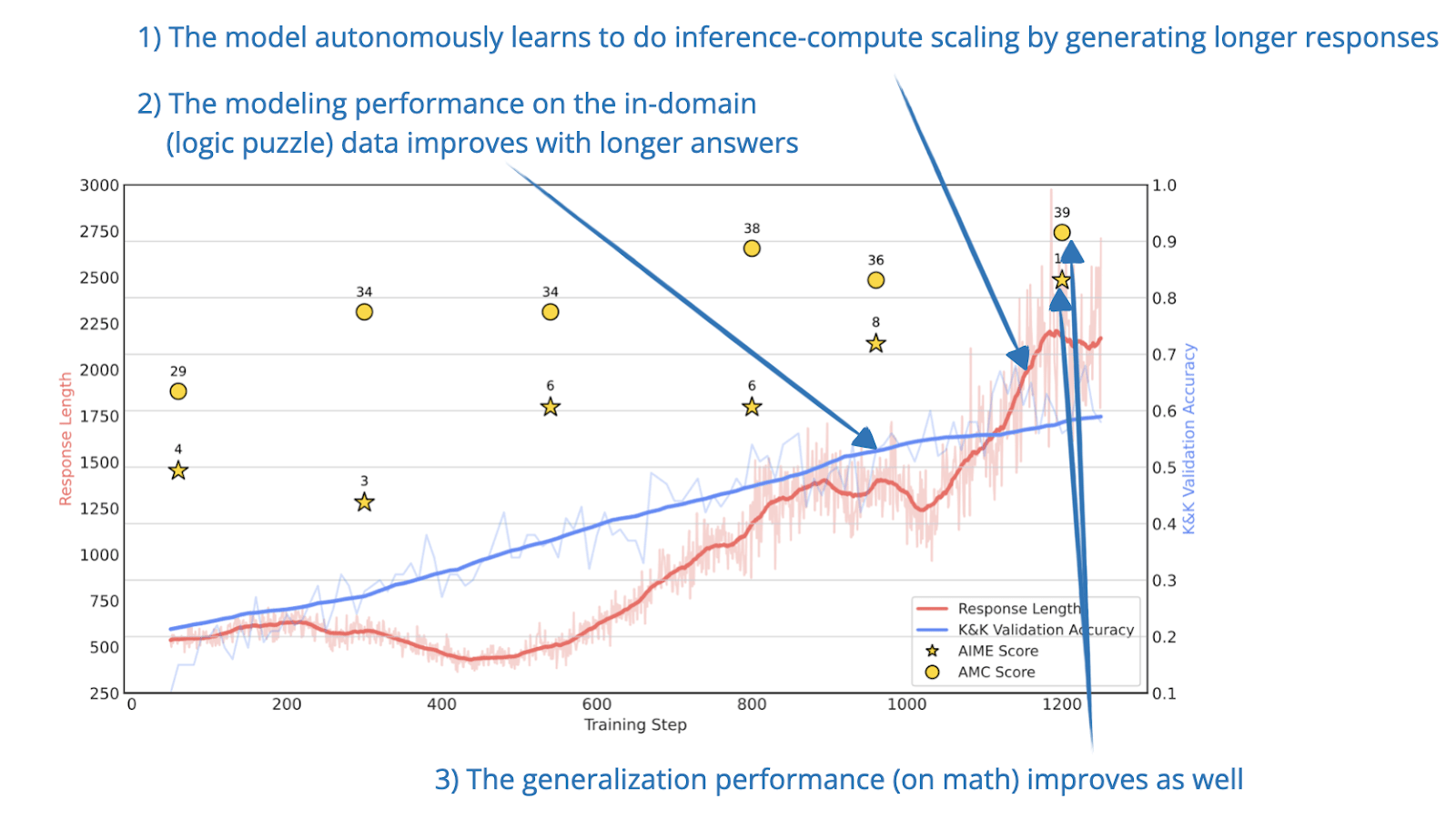 Even with only 5K synthetic logic problems, the model develops good reasoning skills that generalize well to harder math benchmarks like AIME and AMC.