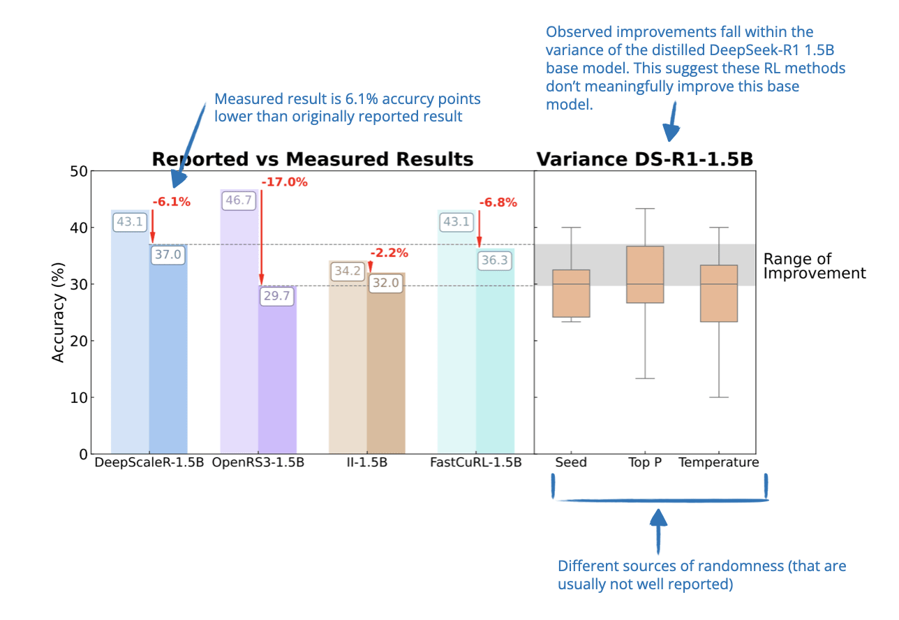 So, while earlier papers reported large performance boosts from RL, this work finds that many of those improvements might just be noise. The authors show that results on small benchmarks like AIME24 are highly unstable: just changing a random seed can shift scores by several percentage points.