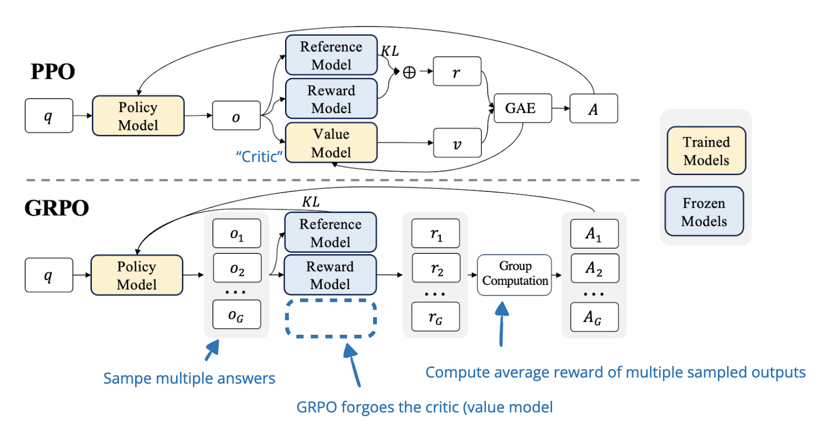 In the analogy, we can think of this critic or value model as a friend we ask to try our new dish before serving it to the customers. We also ask our friend to estimate how a customer would rank it (that’s the expected reward). The reward model is the actual customer then who gives the feedback (i.e., the actual reward).