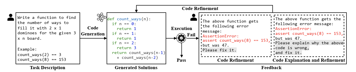Next, we feed the buggy code to an LLM, together with the error messages it generated on the unit tests, and we prompt the LLM to explain where and why errors occurred. Finally, we take the LLMs diagnosis and feed it, the buggy code, and the error messages back to the LLM, together with instructions to repair the bug. This is a version of chain-of-thought reasoning: prior work have shown that asking an LLM to explain the action it intends to take before it takes that action often improves performance.