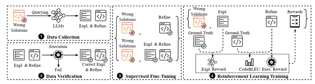 With SFT, we prompted the model with the natural-language instructions, the buggy code, and the error messages from the unit tests. Model outputs were evaluated according to their performance on the unit tests.