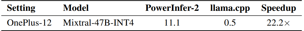 introduces a computational engine on heterogeneous XPUs. It can perform high-speed inference even when the model parameters exceed DRAM capacity. As shown in Table 9, PowerInfer-2 achieves a 22.2× speedup using TurboSparse-Mixtral-47B inference compared to llama.cpp with the original Mixtral-47B. This significant performance gain is primarily because PowerInfer-2 can fully exploit the extremely high sparsity that TurboSparse demonstrates during inference.