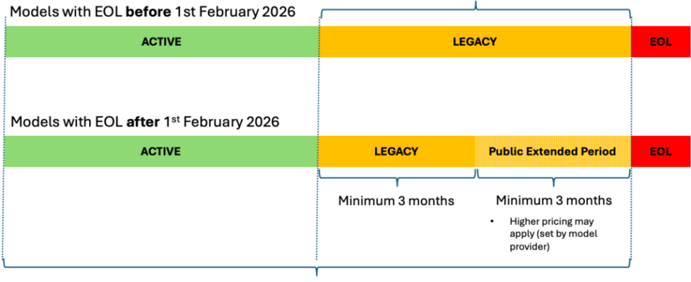 Customers will receive a notification 6 months prior to a model’s EOL date when the model provider transitions a model to Legacy state. This proactive communication approach ensures that customers have sufficient time to plan and execute their migration strategies before a model becomes EOL.