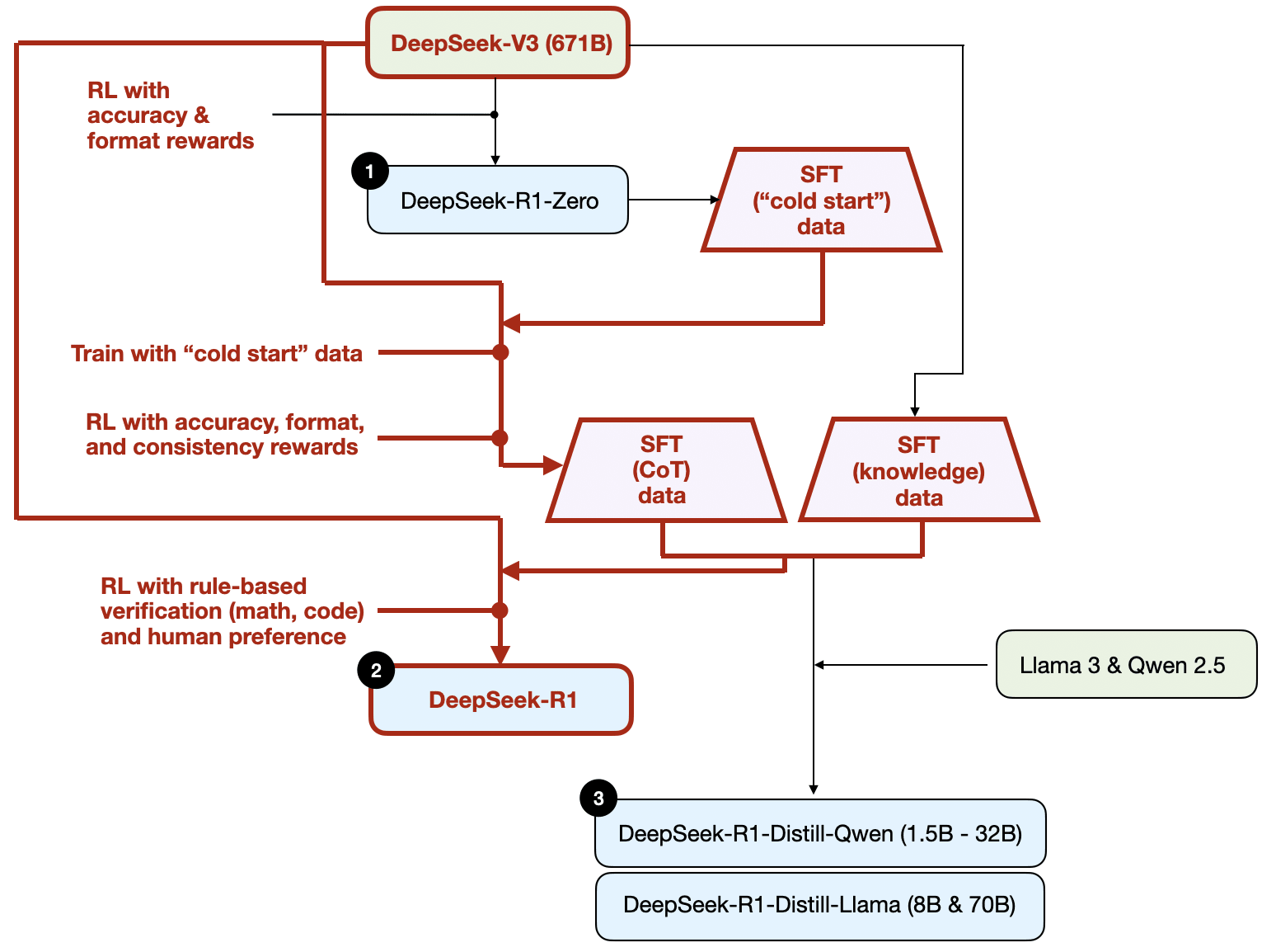 (3) DeepSeek-R1-Distill*: Using the SFT data generated in the previous steps, the DeepSeek team fine-tuned Qwen and Llama models to enhance their reasoning abilities. While not distillation in the traditional sense, this process involved training smaller models (Llama 8B and 70B, and Qwen 1.5B–30B) on outputs from the larger DeepSeek-R1 671B model.
