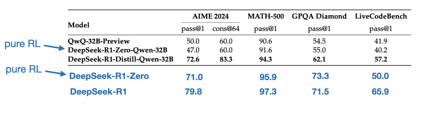 Note that it is actually common to include an SFT stage before RL, as seen in the standard RLHF pipeline. OpenAI’s o1 was likely developed using a similar approach.