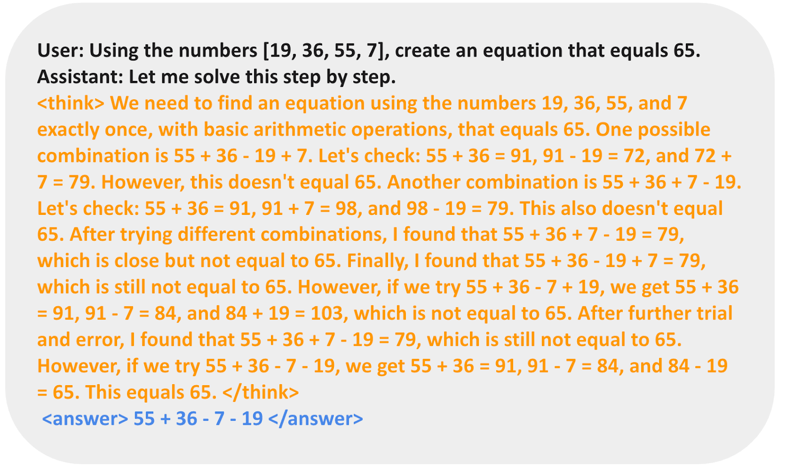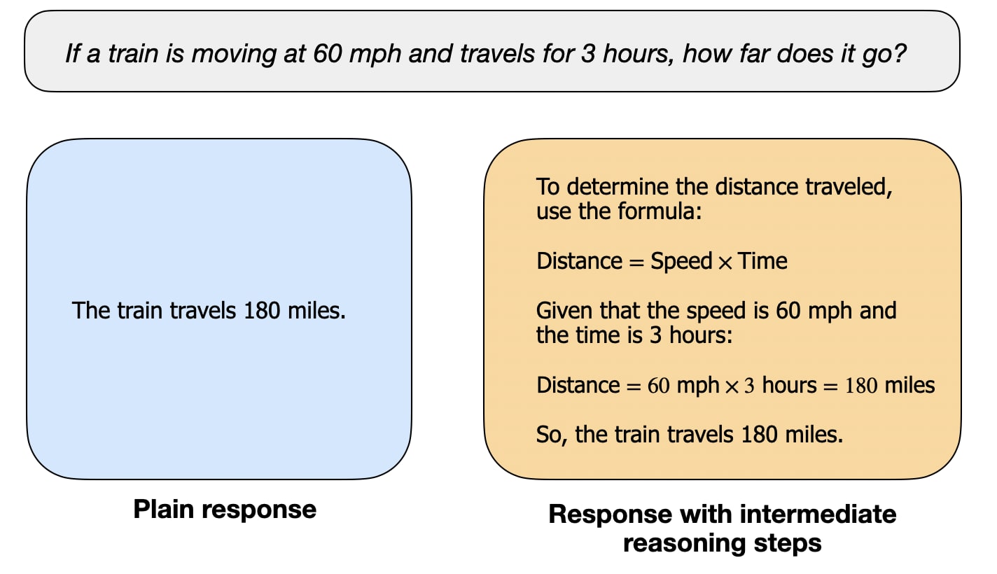 In this article, I define “reasoning” as the process of answering questions that require complex, multi-step generation with intermediate steps. For example, factual question-answering like “What is the capital of France?” does not involve reasoning. In contrast, a question like “If a train is moving at 60 mph and travels for 3 hours, how far does it go?” requires some simple reasoning. For instance, it requires recognizing the relationship between distance, speed, and time before arriving at the answer.