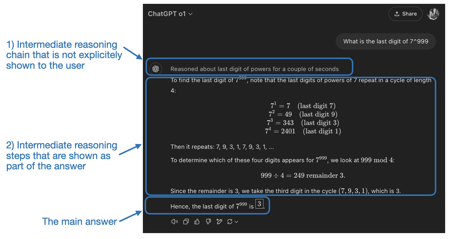 Intermediate steps in reasoning models can appear in two ways. First, they may be explicitly included in the response, as shown in the previous figure. Second, some reasoning LLMs, such as OpenAI’s o1, run multiple iterations with intermediate steps that are not shown to the user.