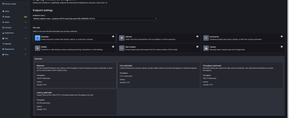 Model deployments through SageMaker JumpStart are fast and straightforward. Customers could select options based on expected concurrent users, with visibility into P50 latency, time-to-first token (TTFT), and throughput (token/second/user). While concurrent user configuration options are helpful for general-purpose scenarios, they aren’t task-aware, and we recognize that customers use SageMaker JumpStart for diverse, specific use cases like content generation, content summarization, or Q&A. Each use case might require specific configurations to improve performance. Moreover, the definition of performance isn’t constrained to just latency, and some customers might measure performance in throughput or lowest cost per token.