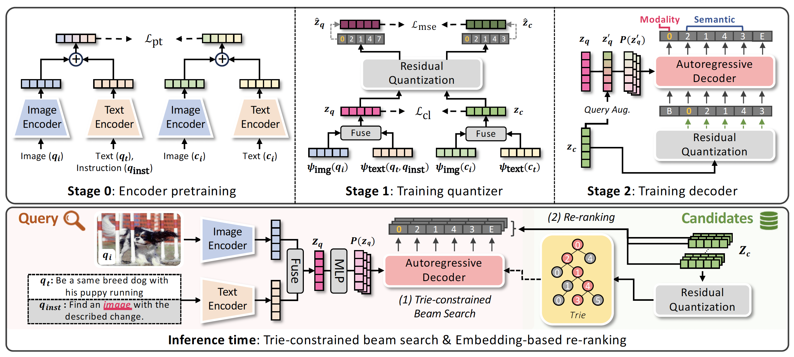 During training, the models target output IDs are generated through residual quantization. Each ID is actually a sequence of codes, the first of which defines the data items modality image, text, or image-text pair. The successive codes define the data items region of the representational space with greater specificity: items that share the first code are in the same general area; items that share the first two codes are clustered more tightly in that area; items that share the first three codes are clustered more tightly still, and so on. The model tries to learn to reproduce the sequence of codes from the input encodings.