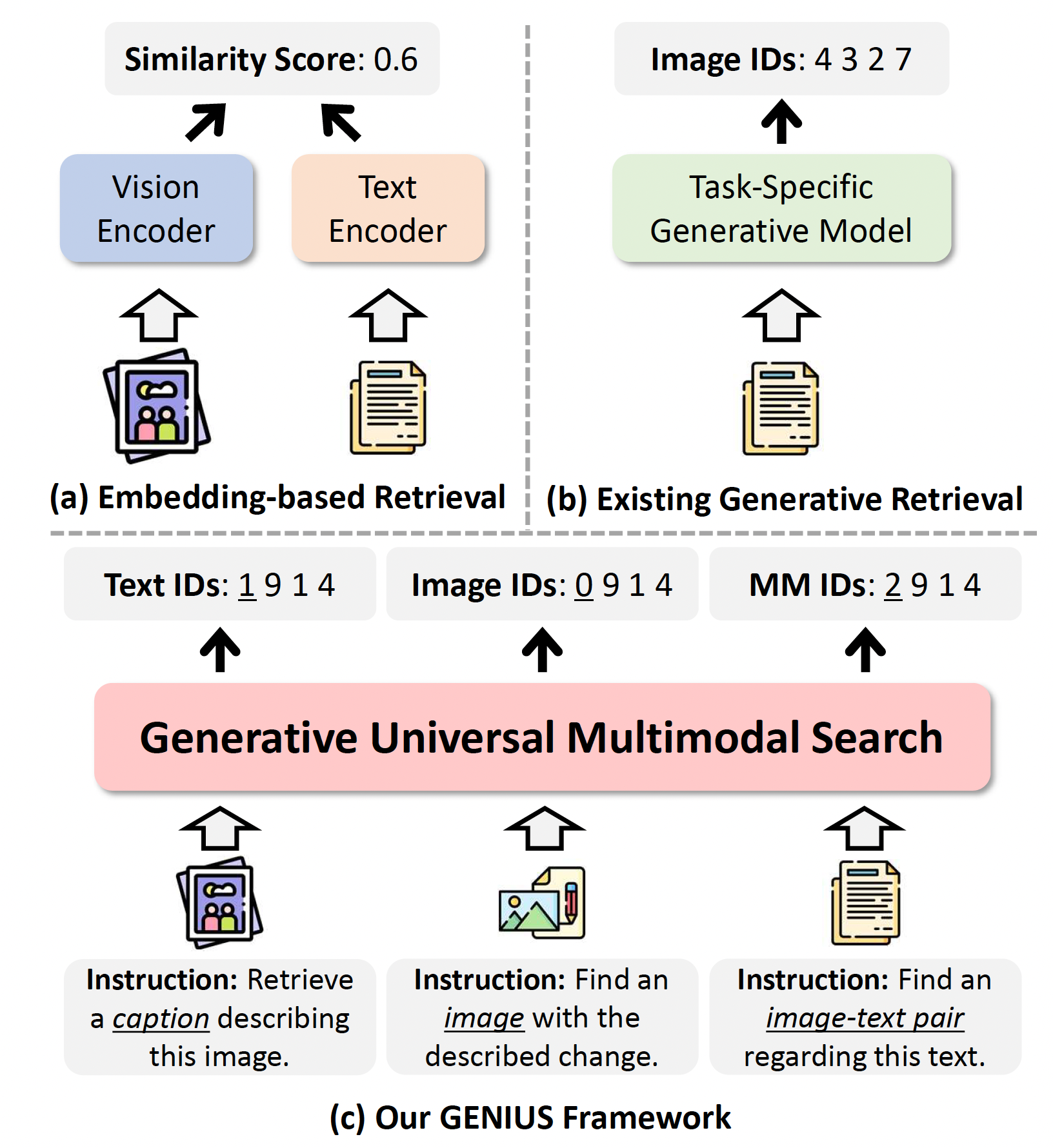 Unlike prior approaches that are limited to single-modality tasks or specific benchmarks, GENIUS generalizes across retrieval of texts, images, and image-text pairs, maintaining high speed and competitive accuracy. Its advantages over prior generation-based models are based on two key innovations: