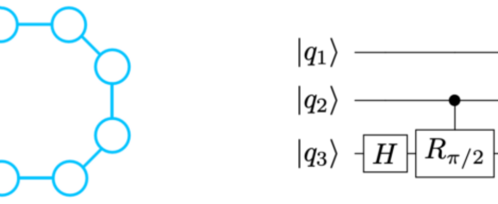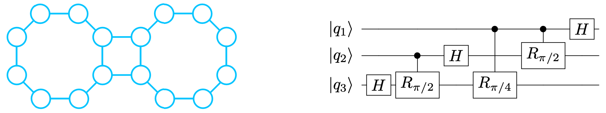 We illustrate the problem of quantum circuit mapping with an example. In the figure below, the schematic at left represents the qubit connectivity of (part of) the Rigetti Aspen M-3 quantum computer. Circles are physical qubits, and lines are physical links that allow the application of two-qubit gates.