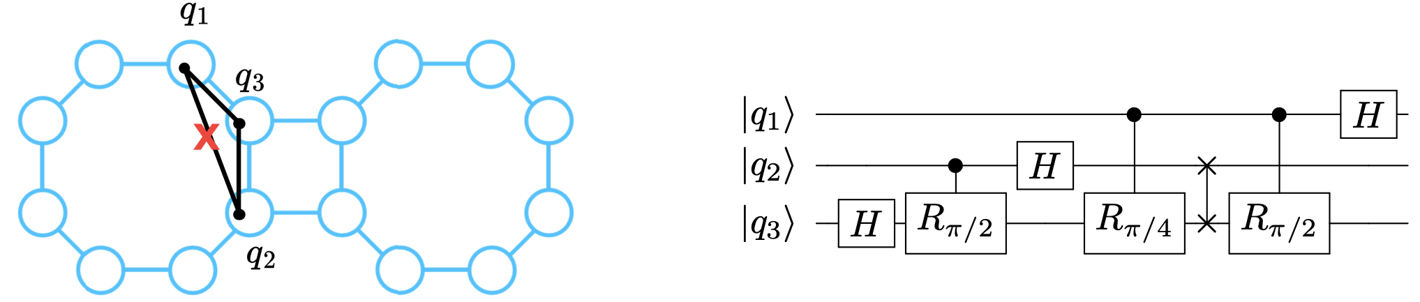 The QFT circuit requires each algorithmic qubit to interact with the other two. However, on the qubit connectivity graph of Aspen M-3, no subgraph forms a three-qubit ring that would allow pairwise qubit interaction. As a result, after initial qubit placement (at left in the figure below), the QFT circuit cannot be directly executed. This type of limitation necessitates the second step in circuit mapping: qubit routing.