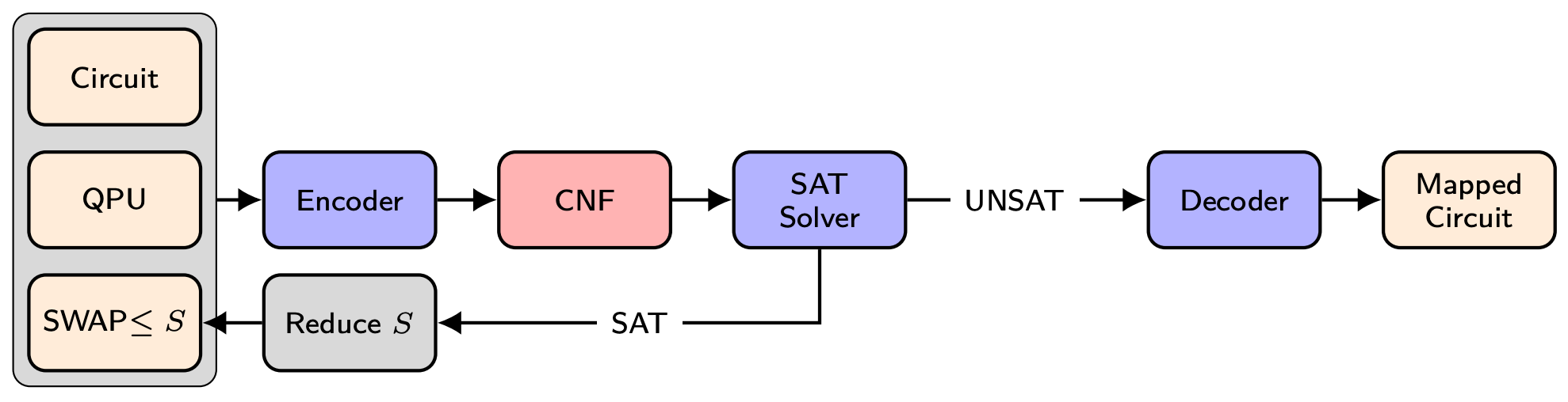 Given three inputs a quantum circuit, a quantum device (QPU), and an initial swap count (S) we encode the quantum-circuit-mapping problem into a SAT formula in conjunctive normal form (CNF). A SAT solver takes the CNF as input and checks its satisfiability. A satisfiable (SAT) result indicates that there is a valid mapping that uses no more than S swap gates. In this case, we reduce the swap count S and continue the loop to search for a mapping with fewer swap gates. We exit the loop when the solver returns UNSAT, which indicates that we cannot decrease the swap count. Finally, we decode a mapped circuit from the best result weve obtained so far.