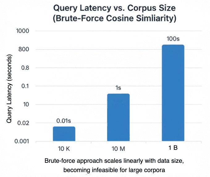 Figure 1: Brute-force cosine similarity scales linearly with corpus size, becoming infeasible beyond hundreds of millions of vectors (source: image by the author).