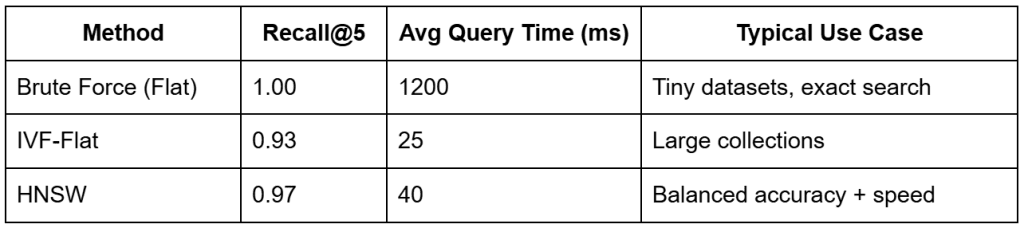 Here, because our dataset is tiny (41 vectors), the difference isn’t dramatic — but with 1M+ vectors, HNSW scales gracefully.