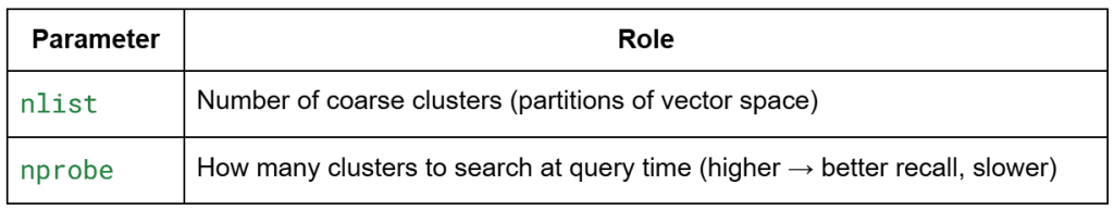 That reduces search complexity from O(N) to roughly O(N / nlist × nprobe).