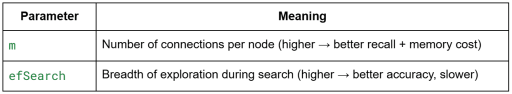 Table 5: Key HNSW parameters controlling graph connectivity and search-time accuracy-latency trade-offs.
