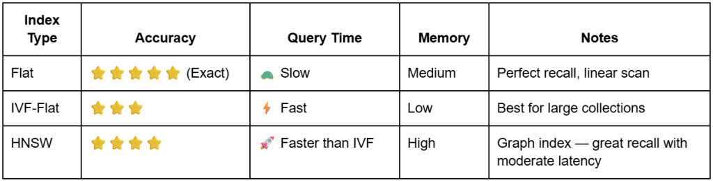 Let’s explore the three we will implement in this tutorial — Flat, IVF-Flat, and HNSW — and see how each balances speed and accuracy.
