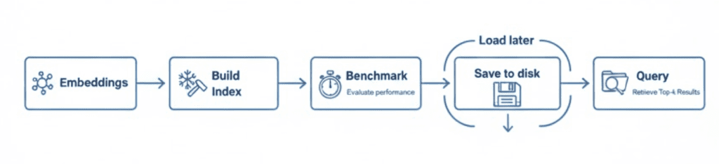 Figure 7: The FAISS index lifecycle — from generating embeddings and building the index to benchmarking, saving for reuse, and querying for top-k results (source: image by the author).