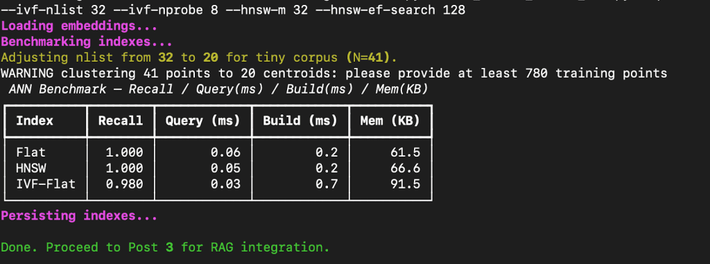 FAISS prints a benchmark table comparing Flat, HNSW, and IVF-Flat across recall, query latency, build time, and memory footprint.